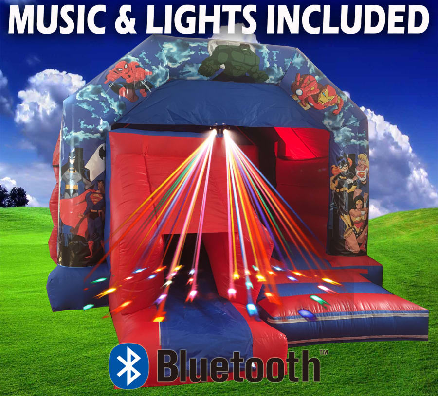 One of our latest most exciting and entertaining products is our cool Super Hero themed bouncy Disco Castle with Front Slide!!