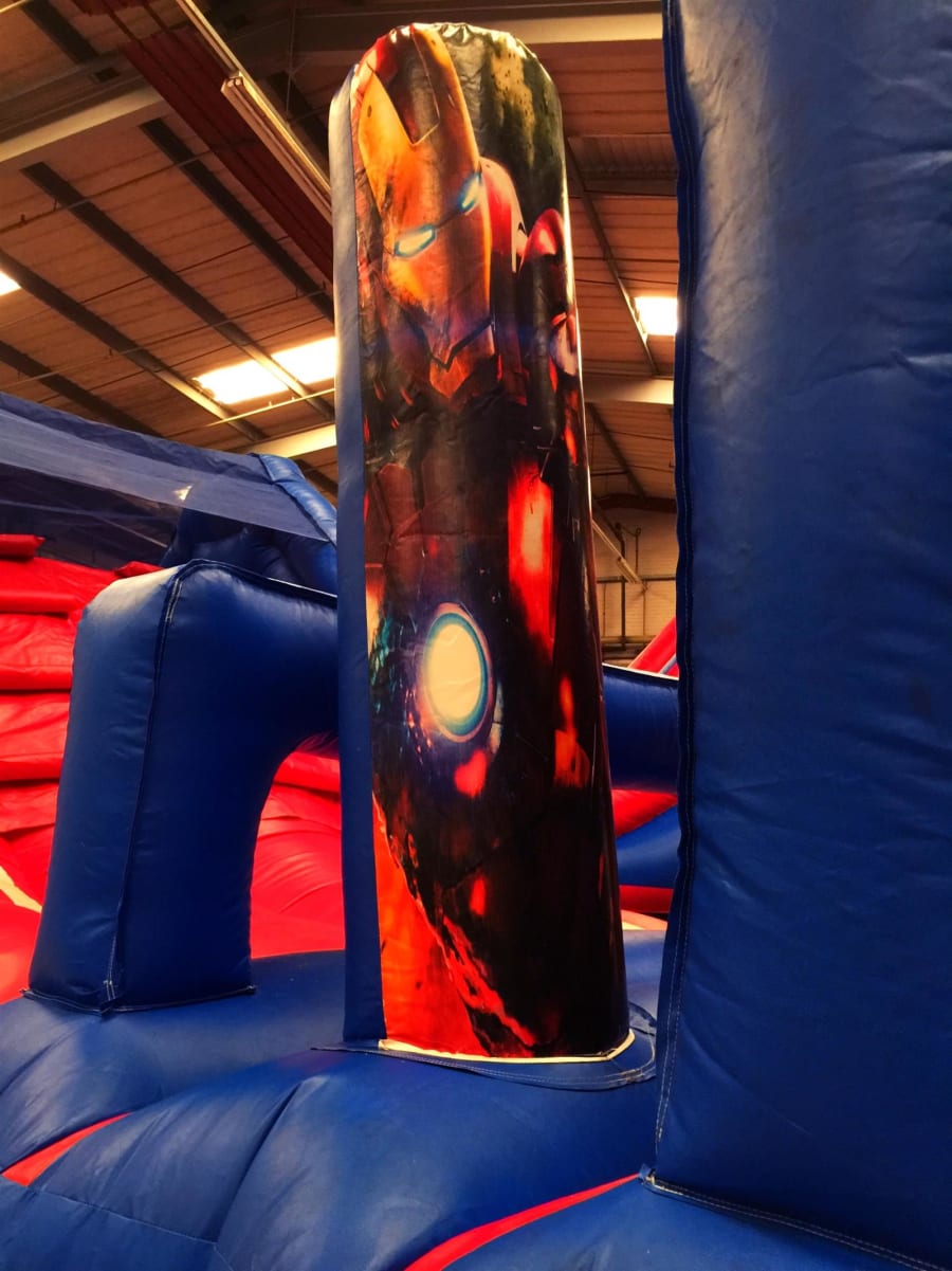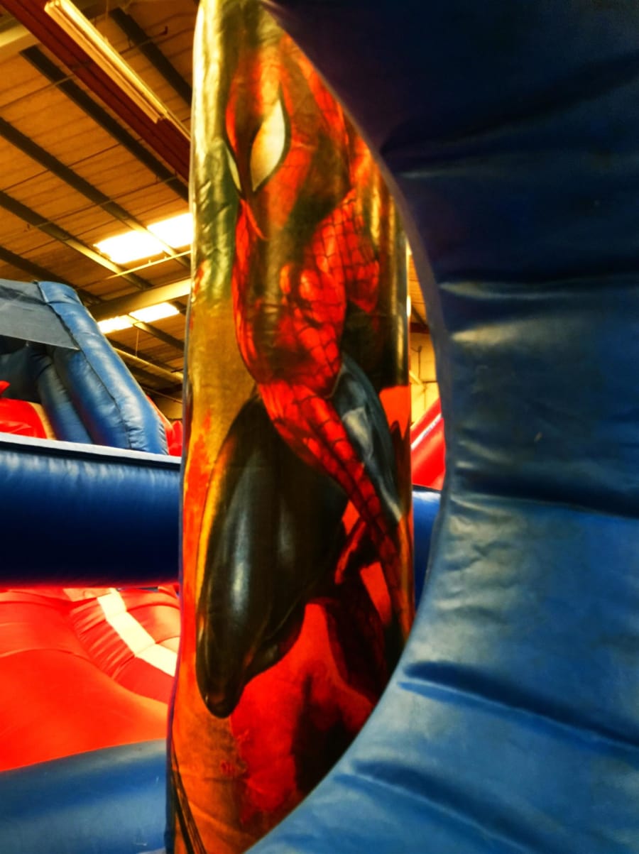A SuperHero Themed Obstacle Course & Slide for use at any children's event, suitable for private hire & fun day events. This Obstacle Course features tunnels, climbing wall, slide & more!